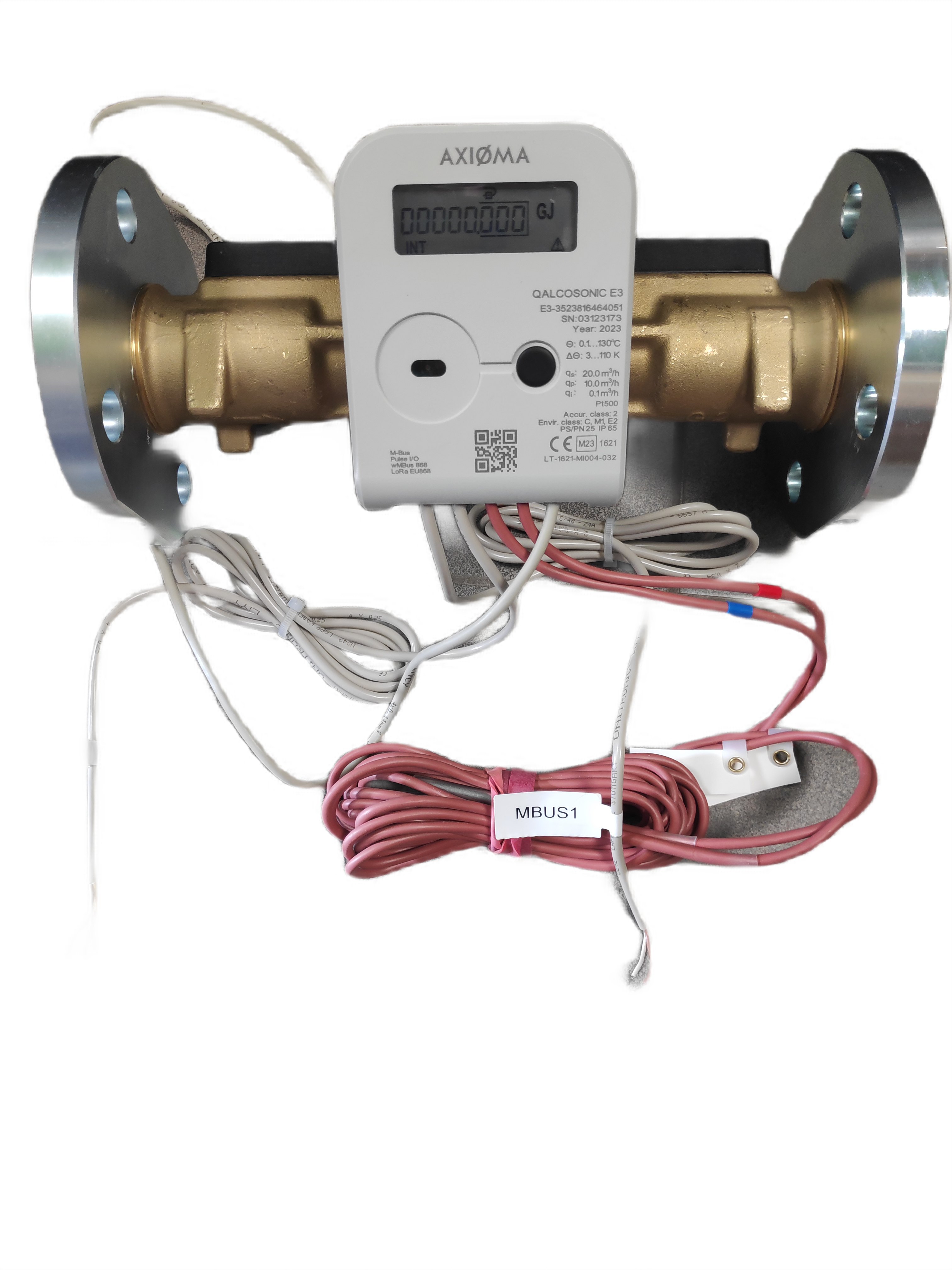 Licznik energii cieplnej i chłodniczej Axioma Qalcosonic E3 DN 80 ze zintegrowanym ultradźwiękowym czujnikiem przepływu z kablem sygnałowym o długości 2,5 m. Zawiera zasilacz 2 x bateria AA, parę czujników temperatury z kablem o długości 3,0 m, m-bus, Modbus i wejście/wyjście impulsowe w standardzie.